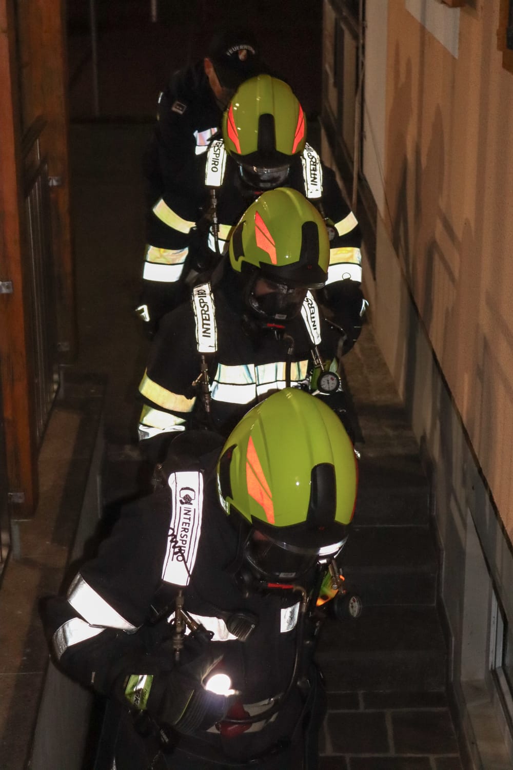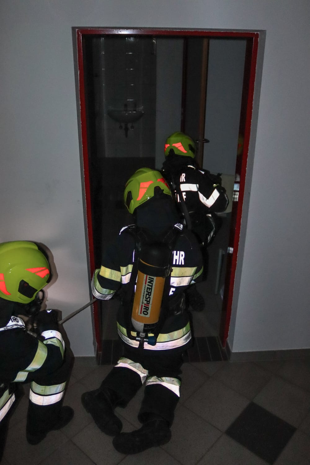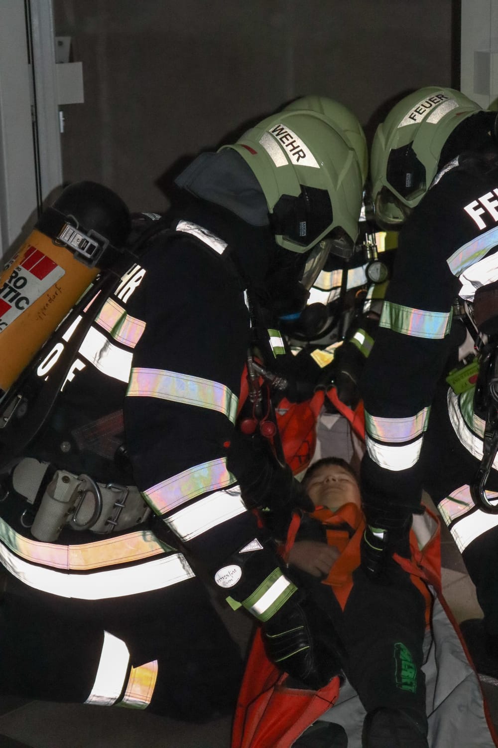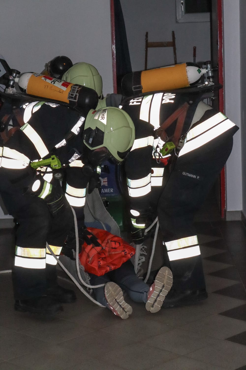 In den Umkleideräumlichkeiten des Sporthauses galten zwei Personen als vermisst. Die Atemschutztrupps mussten die vollständig abgedunkelten Räume unter Nullsichtbedingungen absuchen.