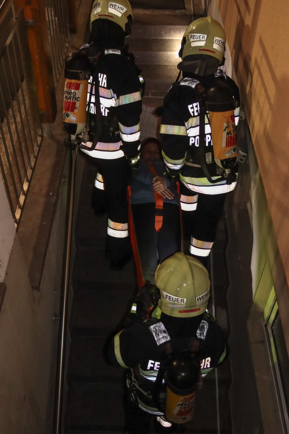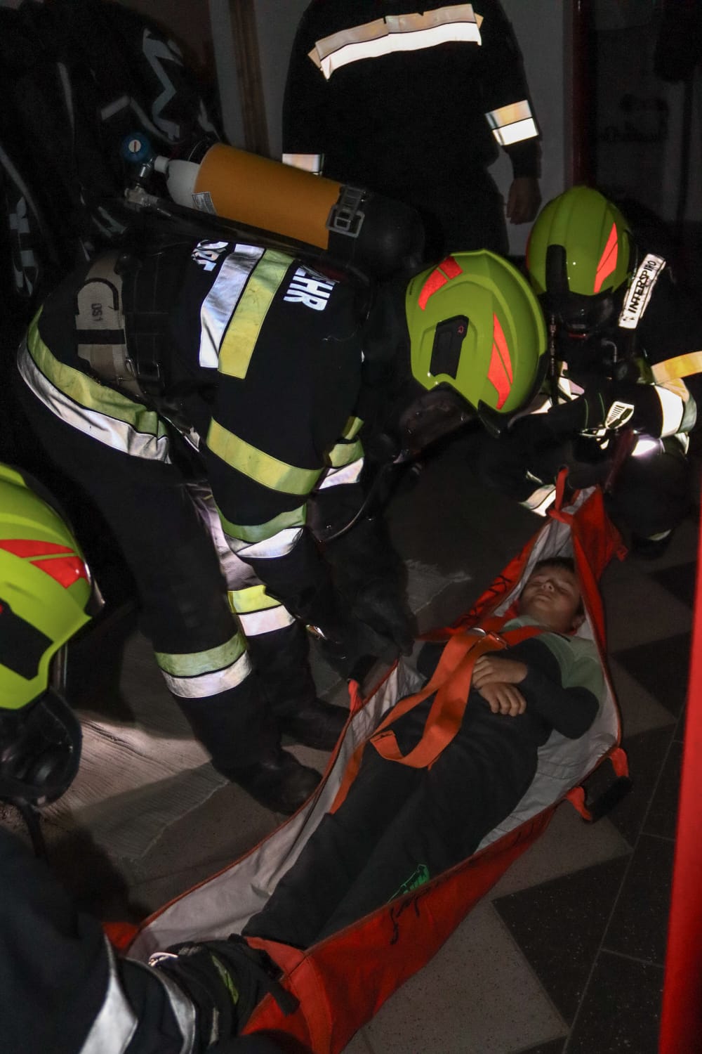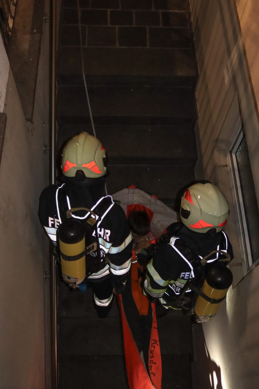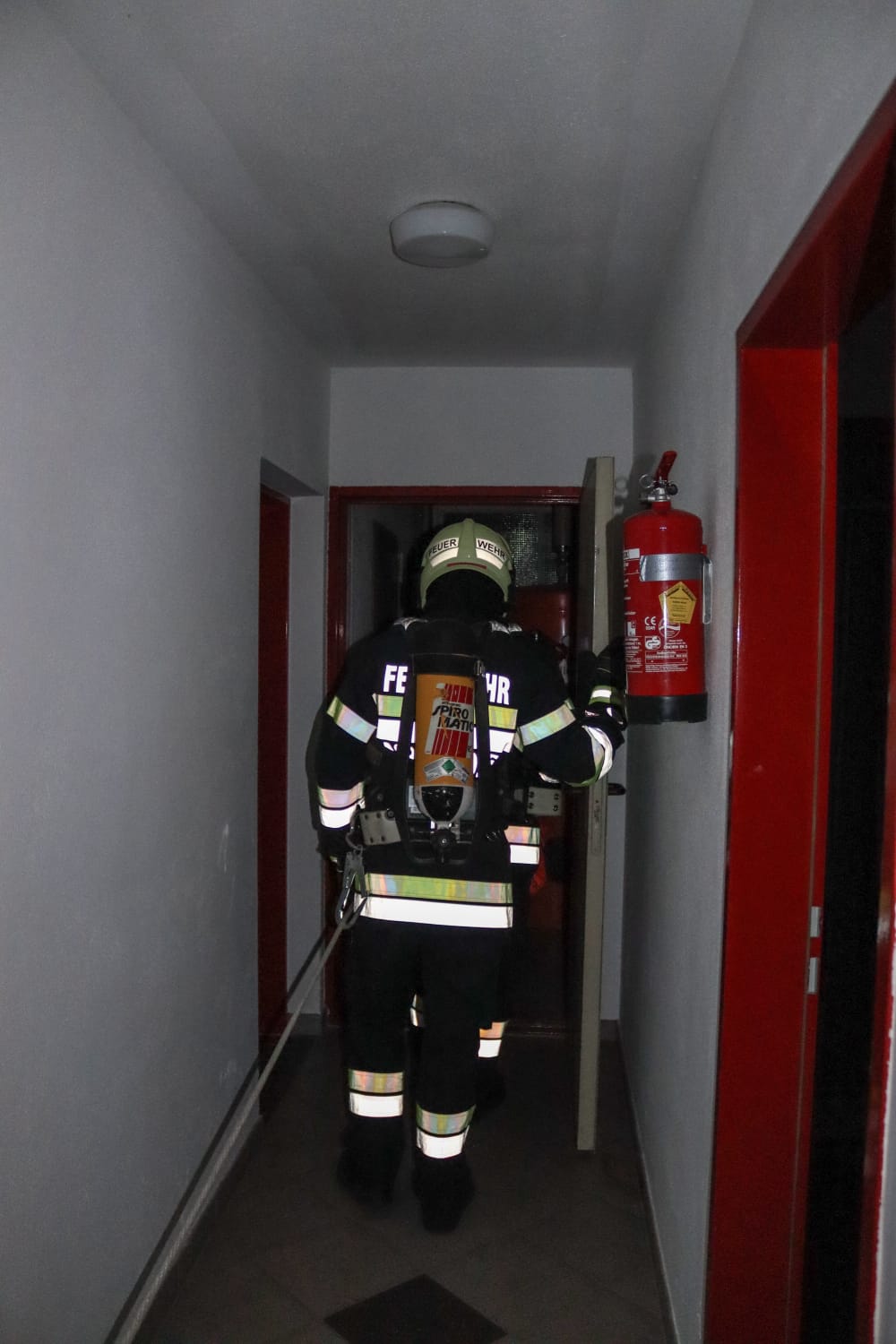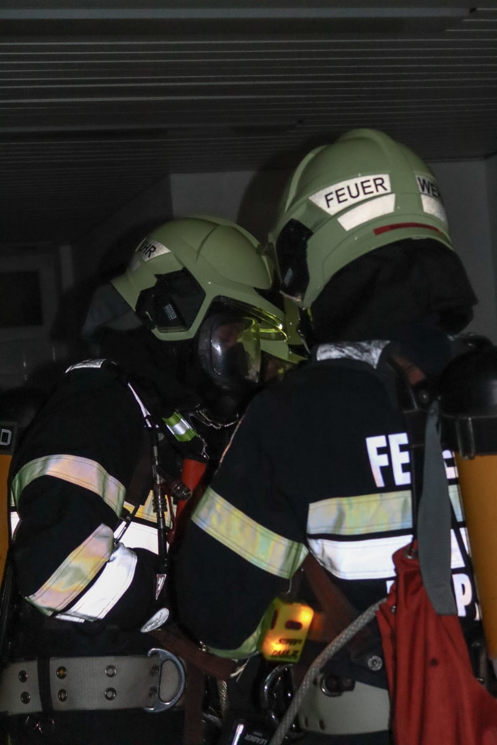 In den Umkleideräumlichkeiten des Sporthauses galten zwei Personen als vermisst. Die Atemschutztrupps mussten die vollständig abgedunkelten Räume unter Nullsichtbedingungen absuchen.