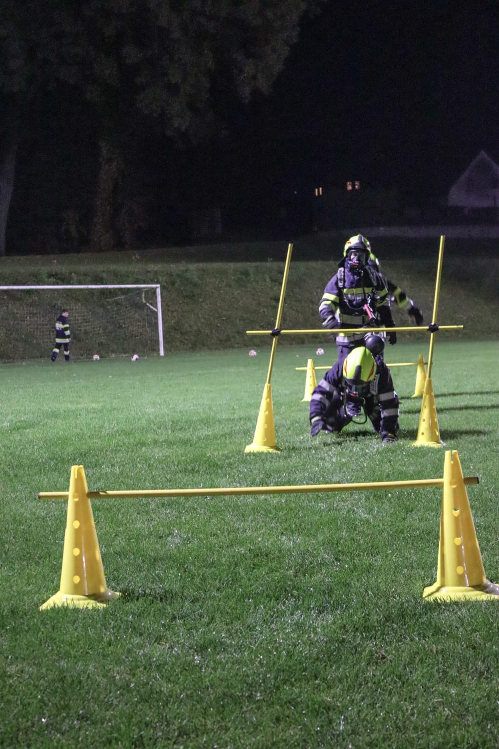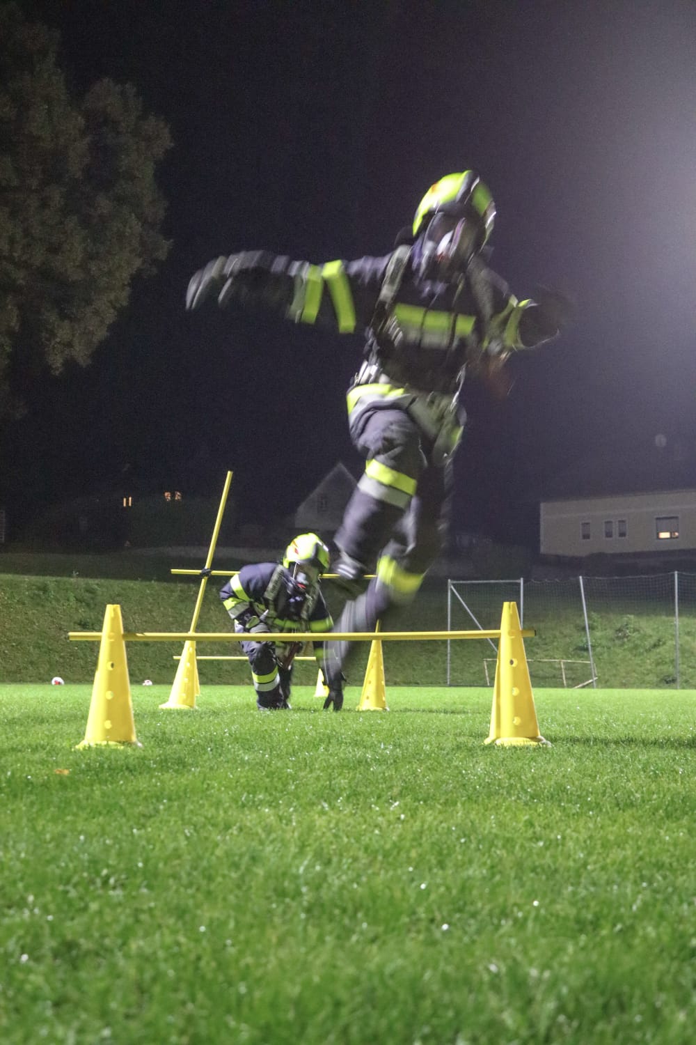 Bei der zweiten Station stand körperliche Belastung und Koordination im Vordergrund. Zunächst mussten die Atemschutzgeräteträger einen Hindernis-Parcours mit einem „Torabschluss“ bewältigen.